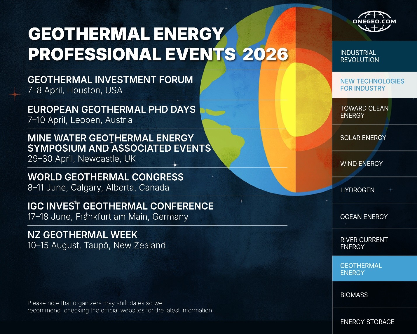 In the section “Geothermal energy” on ONEGEO.COM Global Digital Platform, you can further explore the potential of geothermal energy, its applications in electricity generation, heating, and hot water supply, as well as the geological and technological factors influencing its efficiency. The section also presents insights into environmental impacts, economic considerations, and key challenges limiting its large-scale deployment, alongside information on global initiatives, professional events, and partnerships shaping the future of this sector.